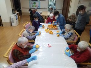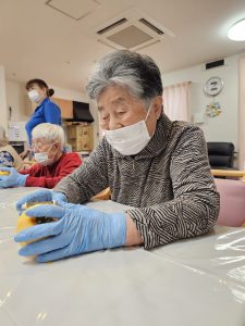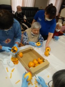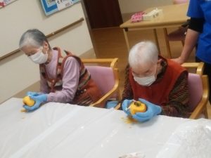 手元に気をつけながら、職員の厳しいチェック(笑)のもと、むき残しがあると職員と利用者様が一緒に確認し、全部で約30個近くの柿の皮むきを行いました。