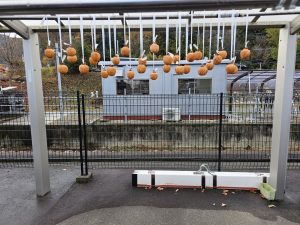 それを紐でくくり、施設の駐車場内で吊るしてこんな感じにしてあります。